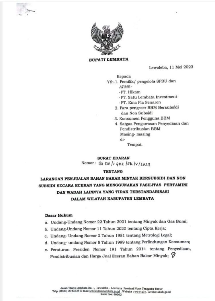 - Dilarang untuk menjual atau menyalurkan BBM bersubsidi dan Nonsubsidi kepada pengecer dalam wilayah Kabupaten Lembata.
