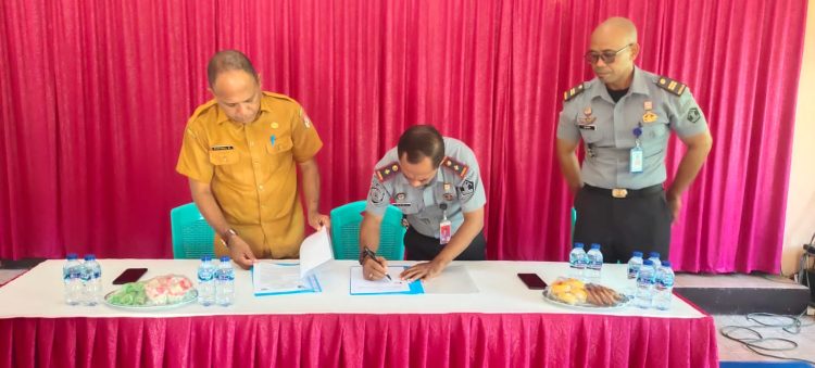 Kepala Lapas (Kalapas) Lembata Hariyadi Maikameng serta Kepala Dinas Ketenagakerjaan dan Transmigrasi (Nakertrans) Kabupaten Lembata sedang melakukan Penandatanganan Perjanjian Kerja Sama (PKS)