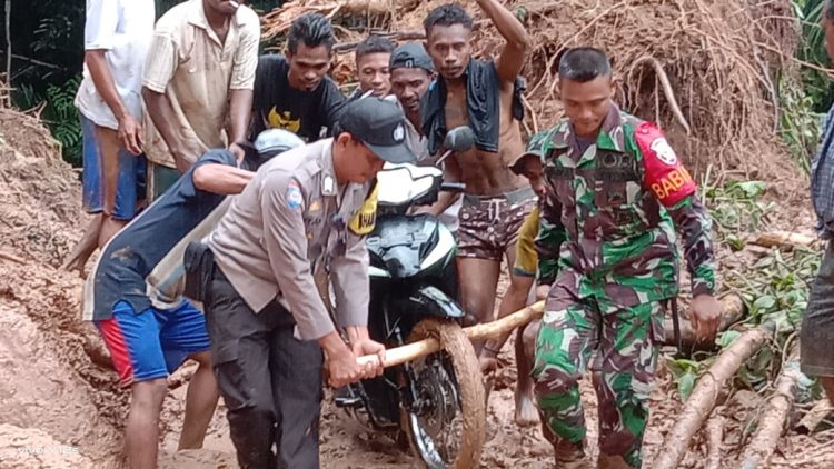 Hadir juga Personil TNI dan Polri serta masyarakat melakukan evakuasi warga dan kendaraan roda dua yang hendak melintas secara gotong royong.