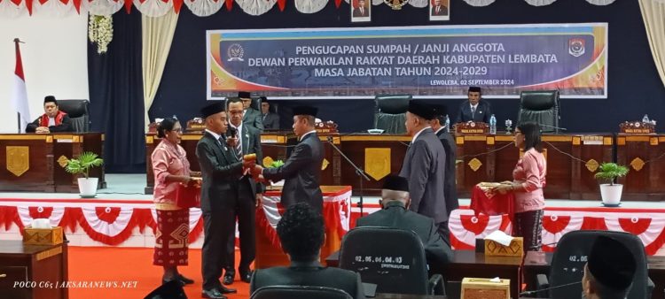 LEMBATA, AKSARANEWS.NET – Sebanyak 25 Anggota Dewan Perwakilan Rakyat Daerah (DPRD) Lembata terpilih periode 2024 – 2029 resmi dan sah dilantik secara khidmat di ruang rapat paripurna DPRD Lembata, Senin (02/9/2024).