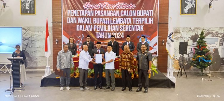 LEMBATA, AKSARA NEWS. NET – Komisi Pemilihan Umum (KPU) menggelar Rapat Pleno Terbuka untuk menetapkan pasangan Calon Bupati dan Wakil Bupati terpilih Kabupaten Lembata hasil Pemilihan Kepala Daerah (Pilkada) 2024, Kamis (9/1/2024) di Olympic Ballroom Lewoleba.