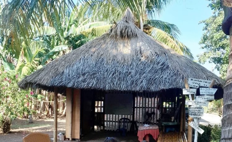 Tak ada anak-anak siang itu. Hanya tiupan angin yang menyentuh atap daun kelapa dan dinding belahan bambu. Di dalamnya, tampak sebuah lemari berisi buku-buku, meja, beberapa kursi, papan tulis, dan papan jadwal kegiatan.