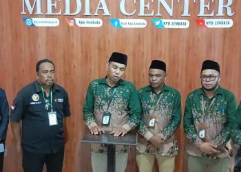 Ketua KPU Lembata bersama anggota didampingi Ketua Bawaslu Lembata dan anggota saat memberikan keterangan kepada awak media